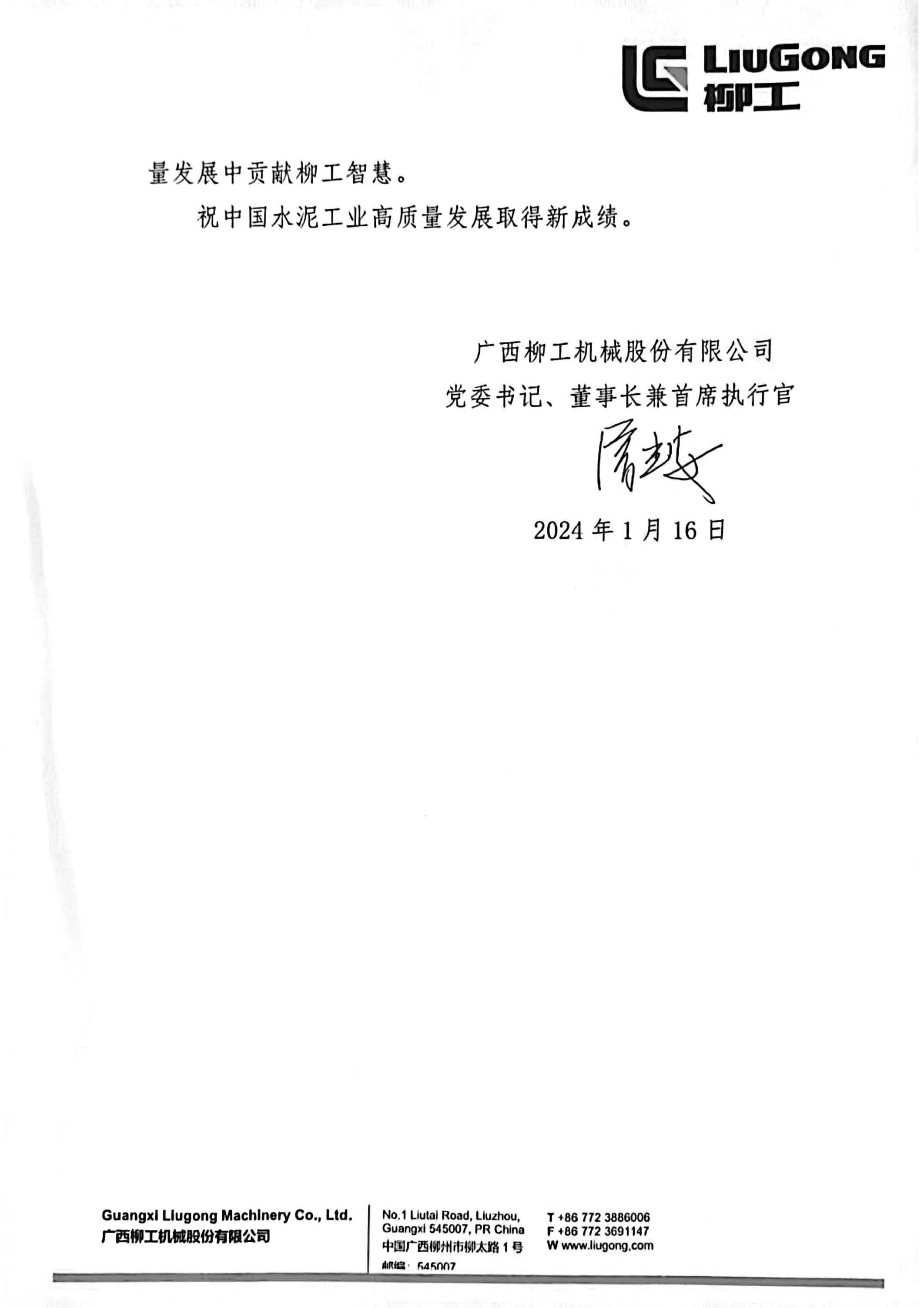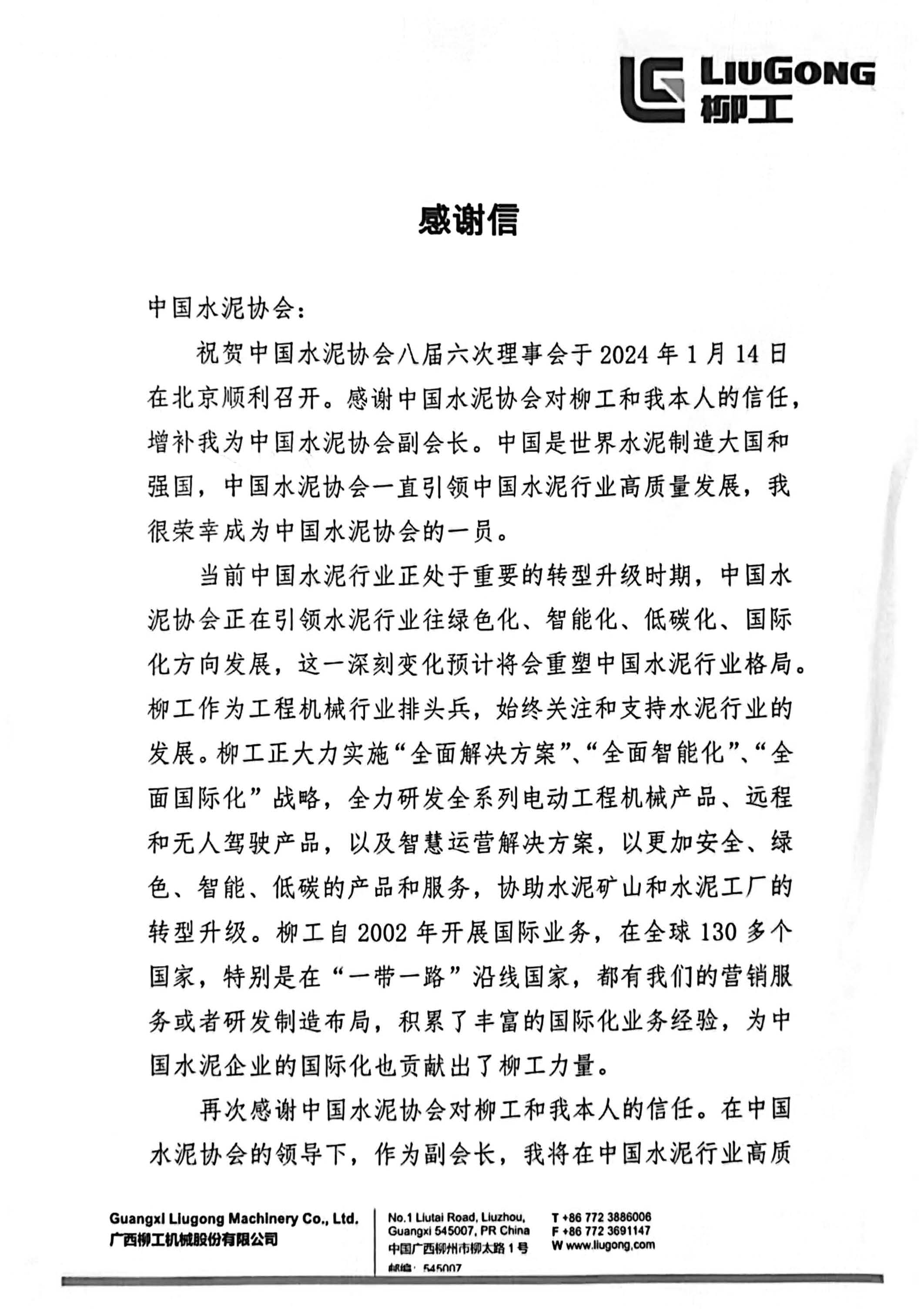 感謝信-廣西柳工機械股份有限公司